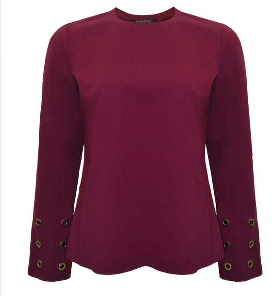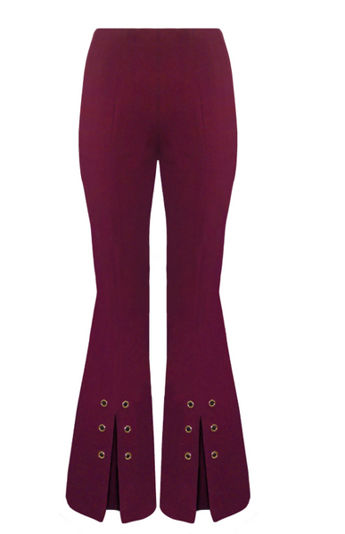 Burgundy Flared Vented Scuba Knit Pant with Grommets.